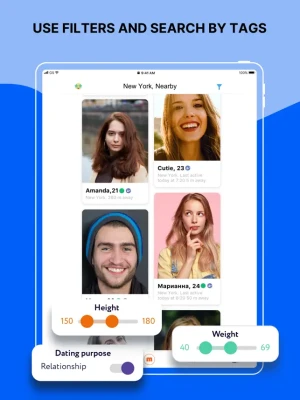 • You can search for your partner by different criteria: age, height, weight, relationship goals, and location. It’s easy, fast and free!